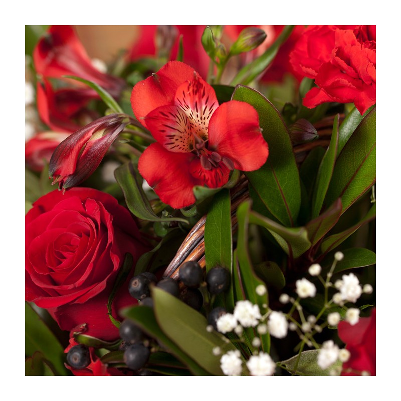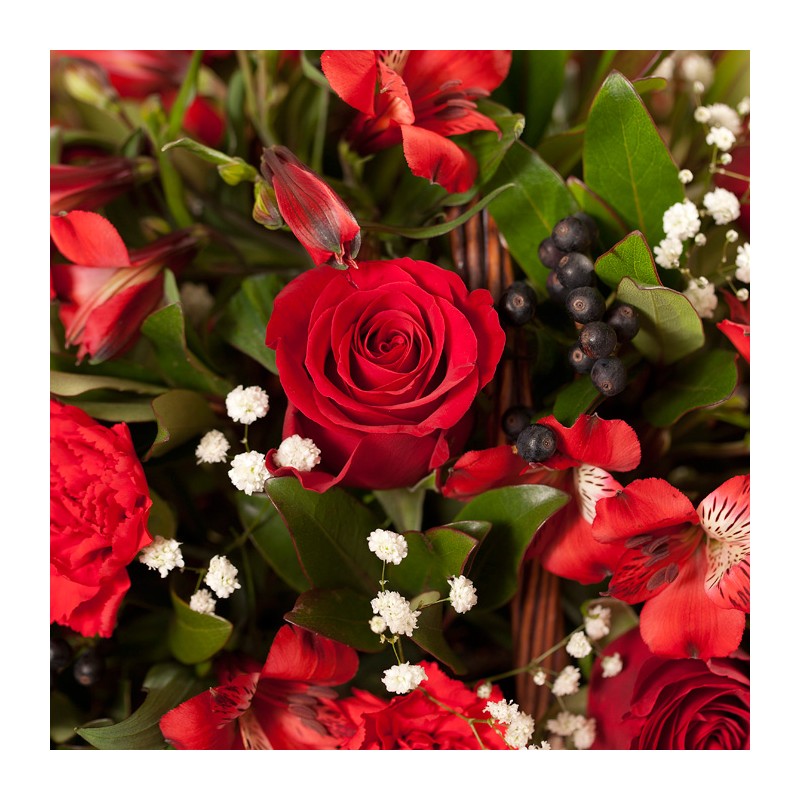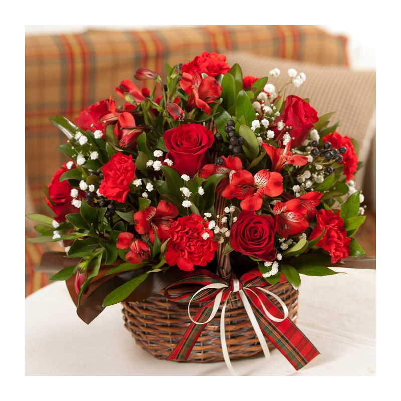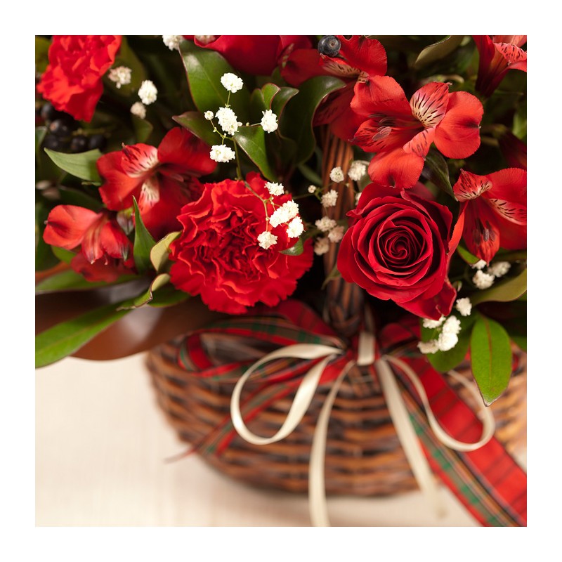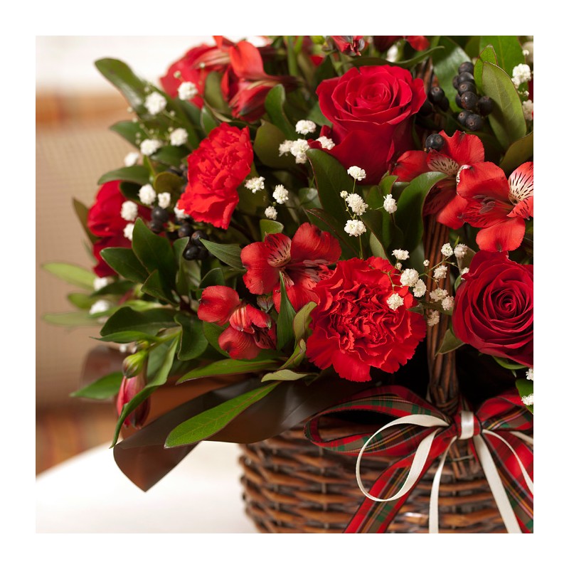 Celebrate the joy of giving with this red colored flower with seasonal green with Christmas decoration! This basket will bring years of joy with your receiptant. Product consits: Red rose and green plants with Christmas decorations. Dimension: 35 x 40 cm
