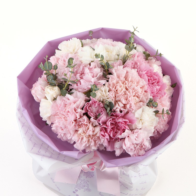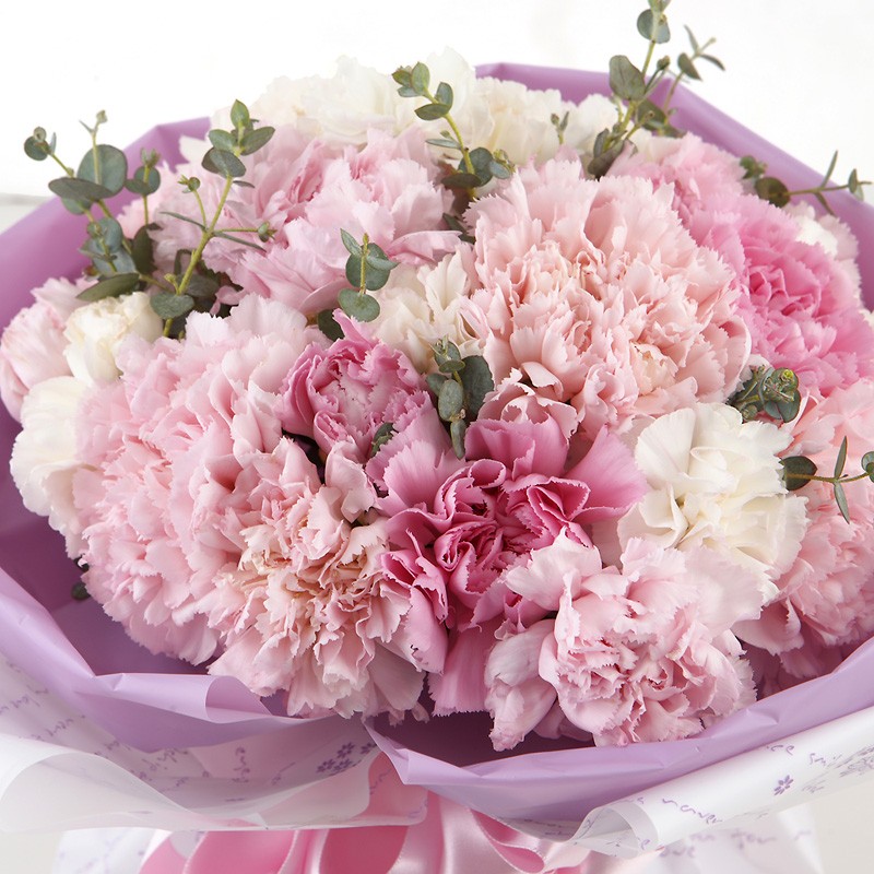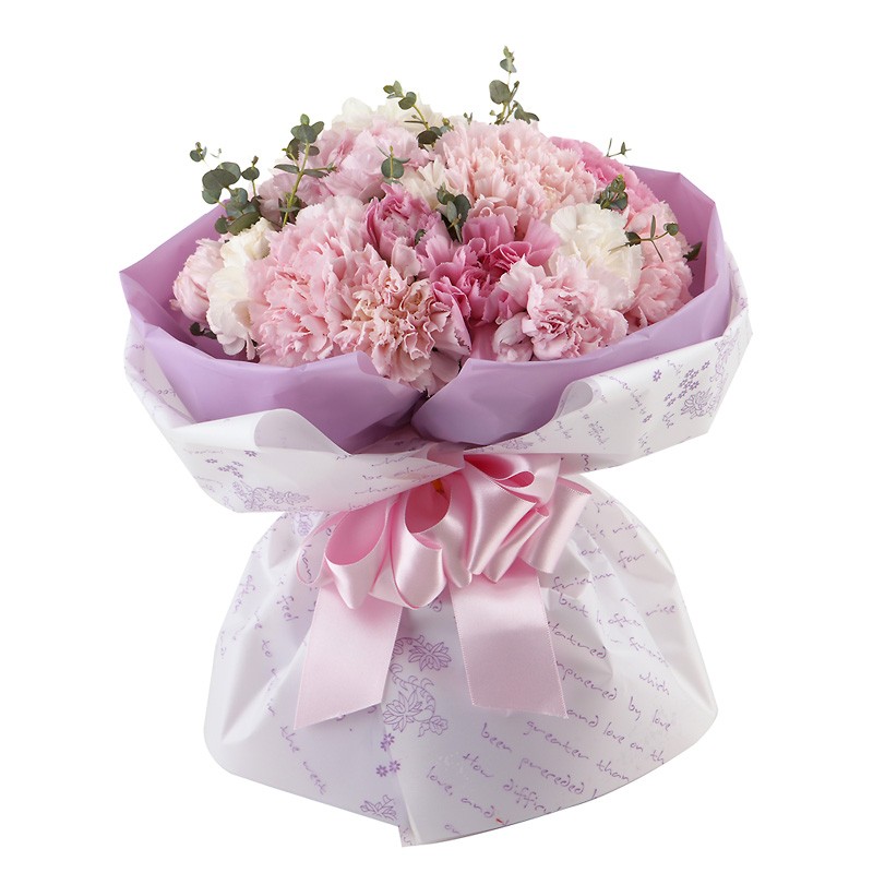 A pale pink carnations are arranged in a cute bunch. It's a perfect gift for any occasion.