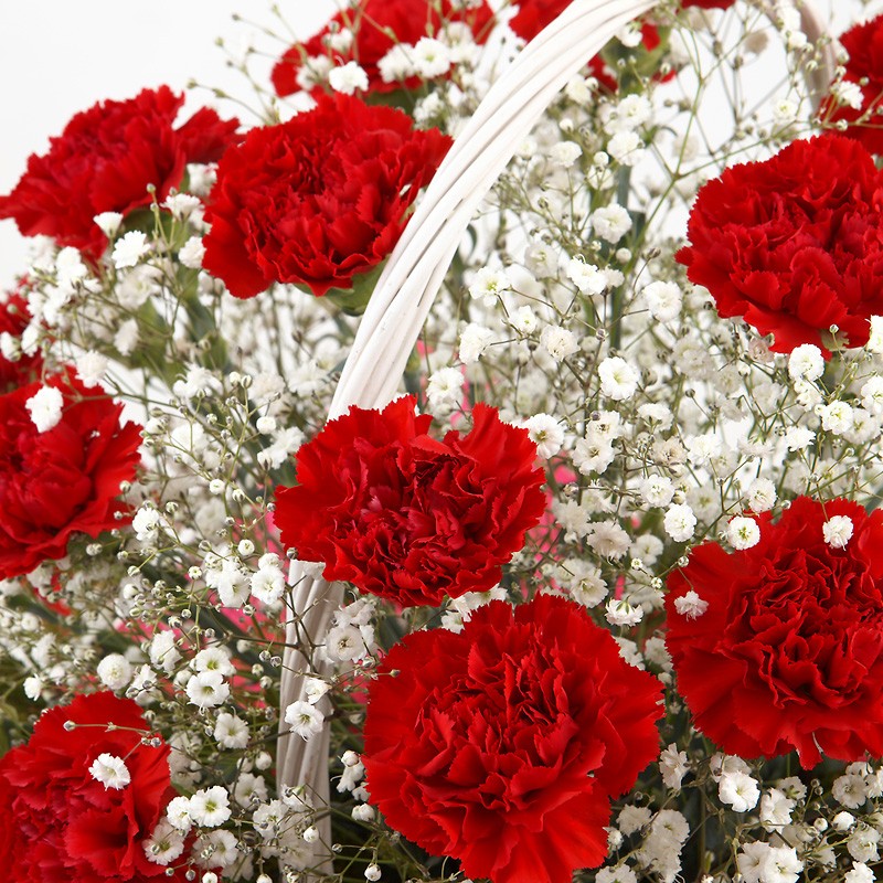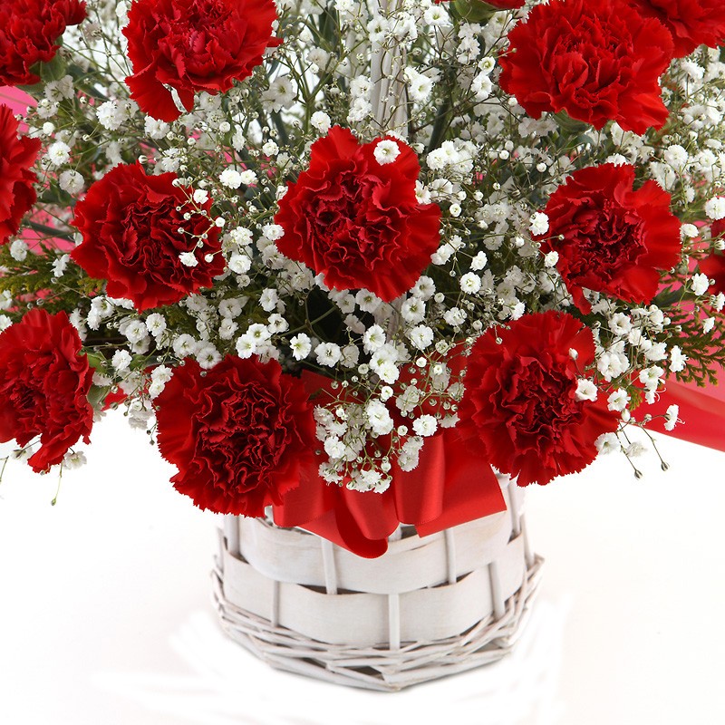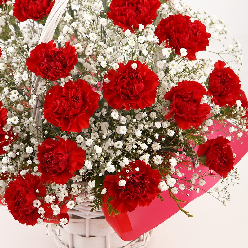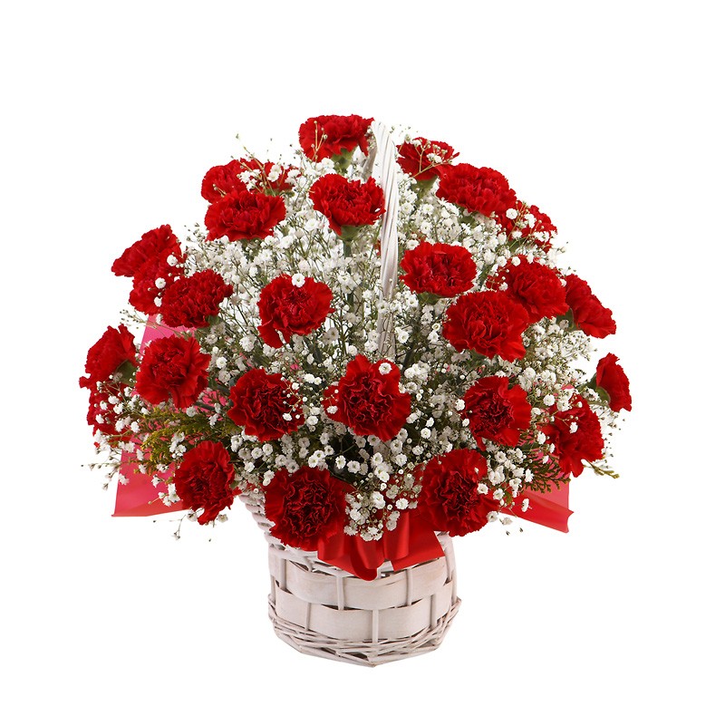 A sweet basket to make someone smile. This basket is the Red carnation with the gypsophila.