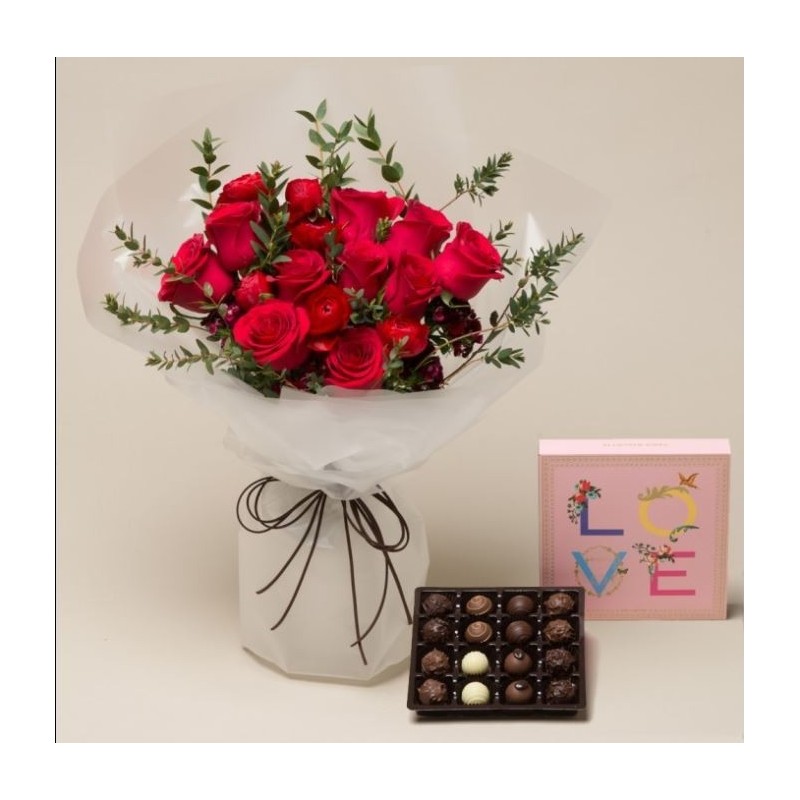 A box of High Quality Chocolates and Say Love bouquet.