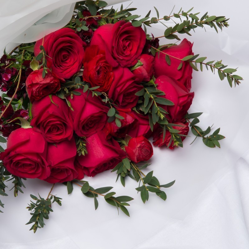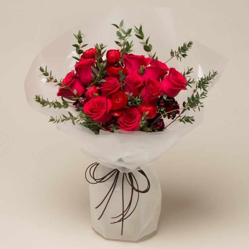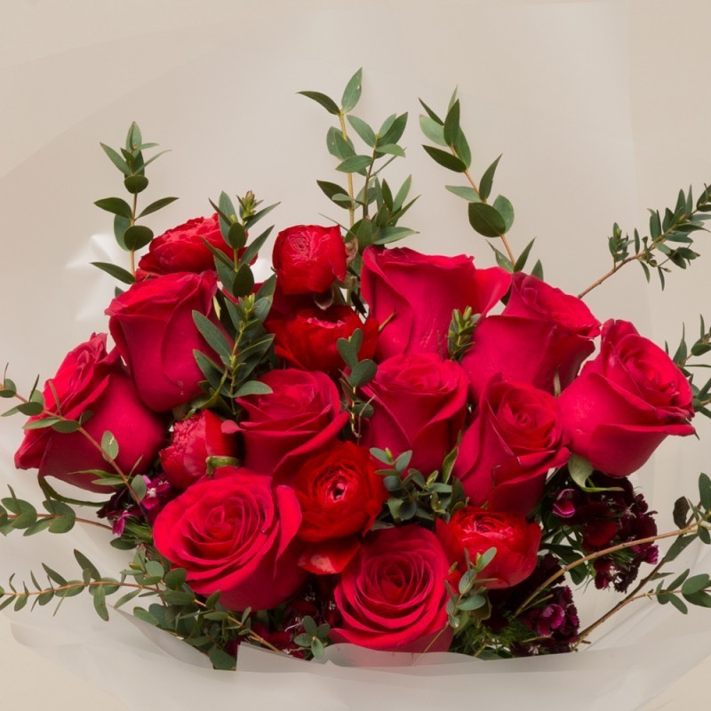 Product consists: Red roses and Red Ranunculus with seasonal greens.