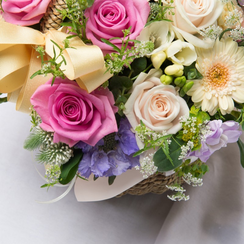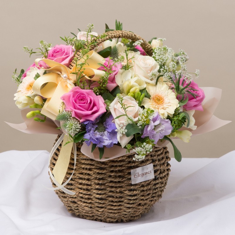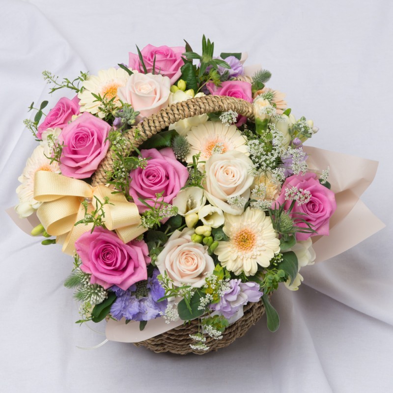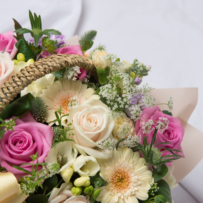 Product consists: Pink and Cream rose with seasonal blooms and greens.