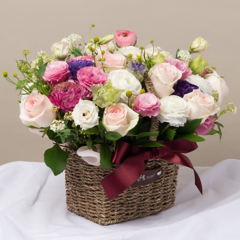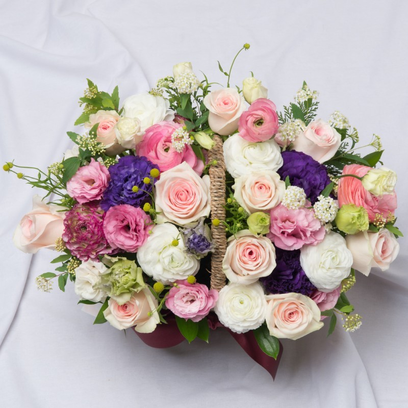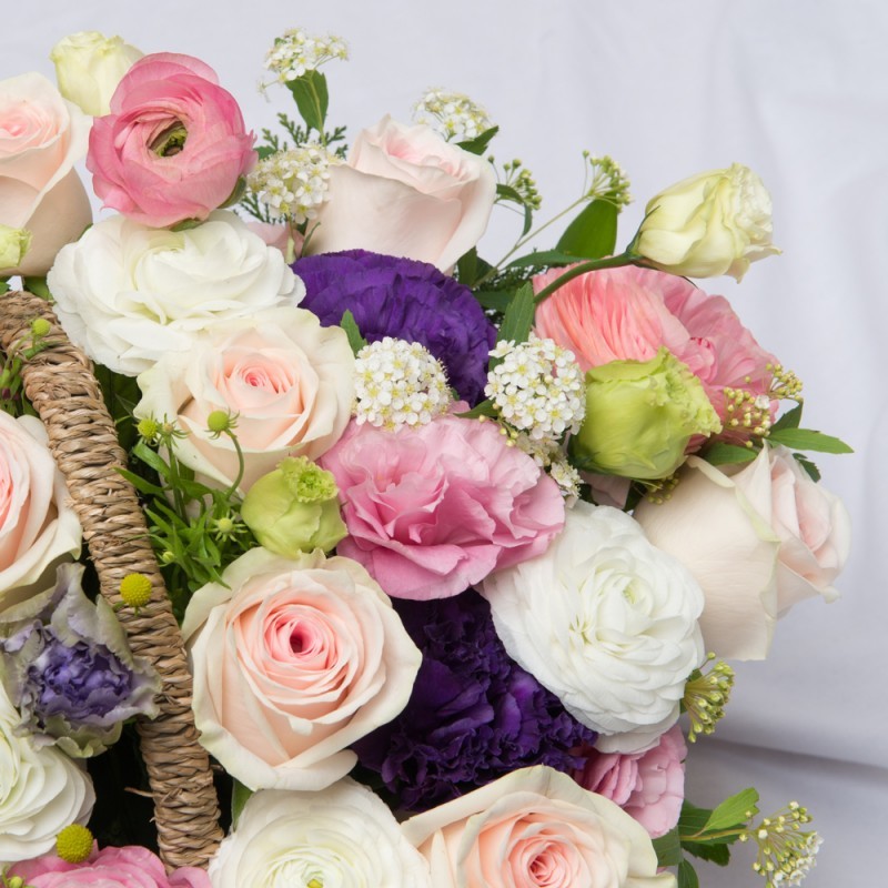 Product consists: Pink and Violet rose, Carnation with seasonal blooms and greens. Dimension: 40 * 30 cm