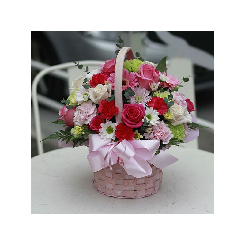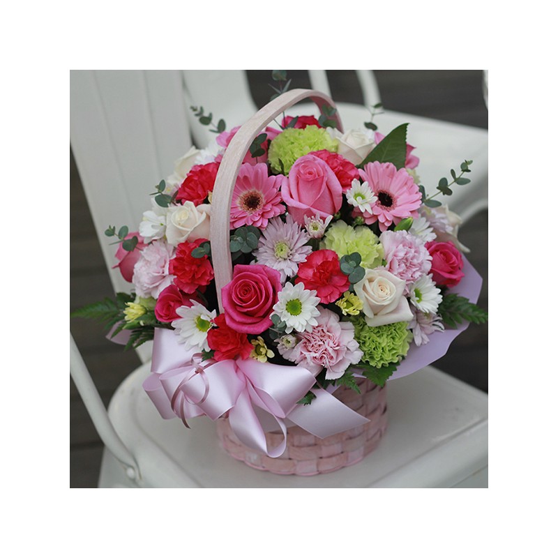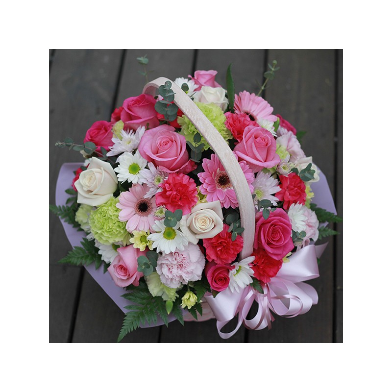 Express your thankful heart with this Pink Carnation, Pink roses arranged with fresh seasonal Pastel tone blooms in a basket.