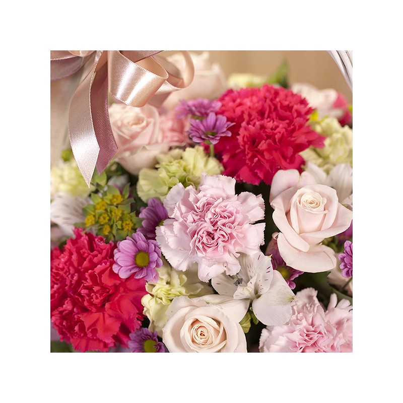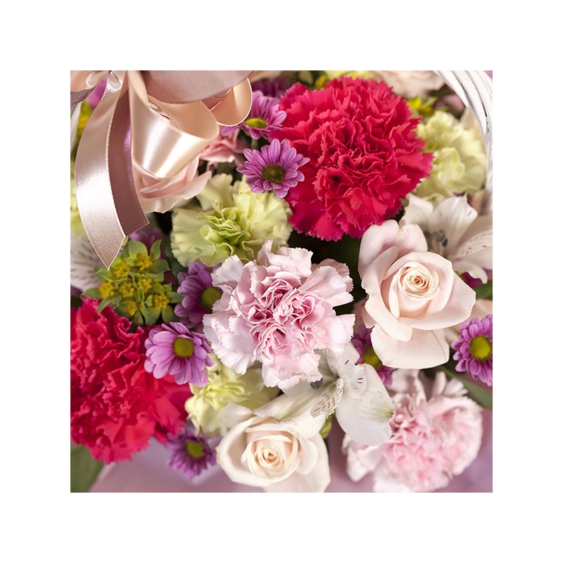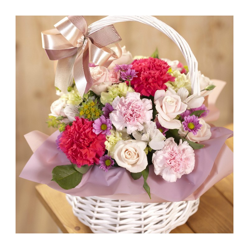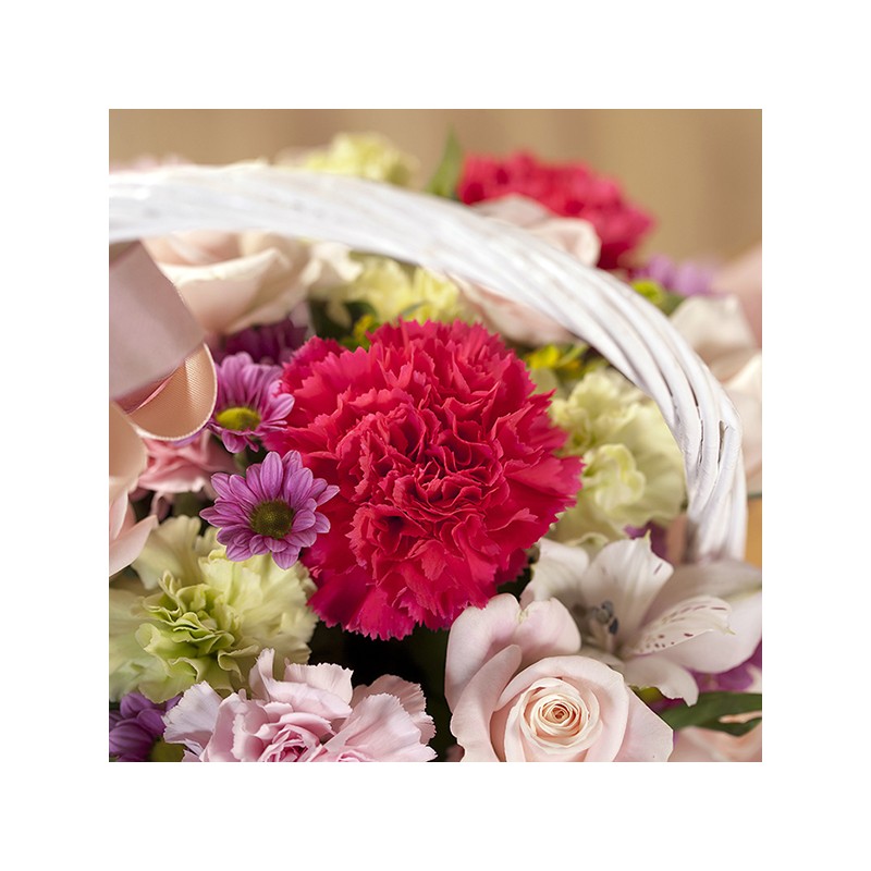 Express your thankful heart with this pink carnations arranged with Alstroemeria and Roses as fresh seasonal harmonized tone blooms in a basket.