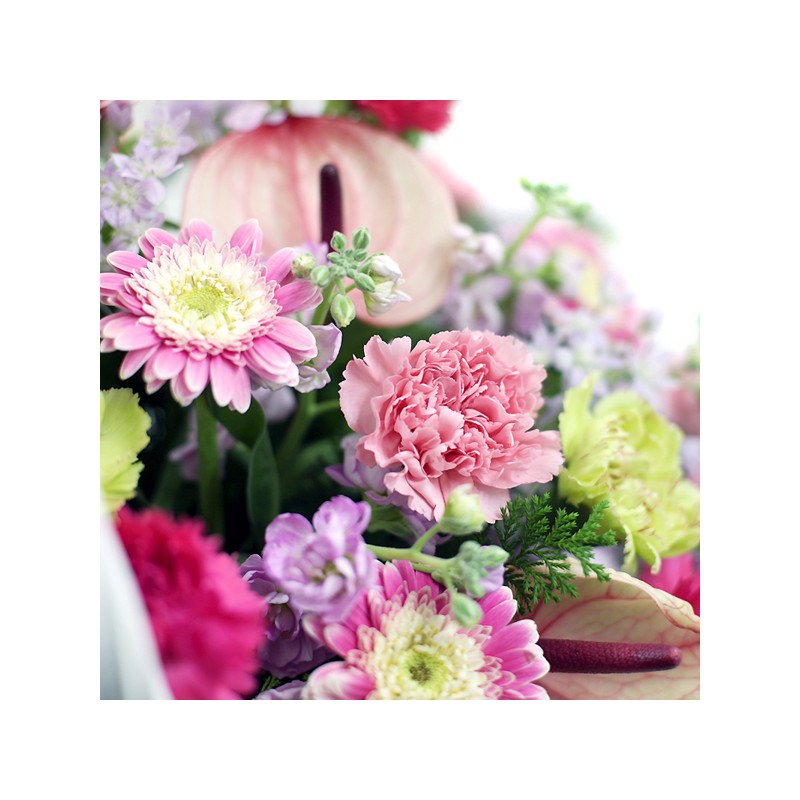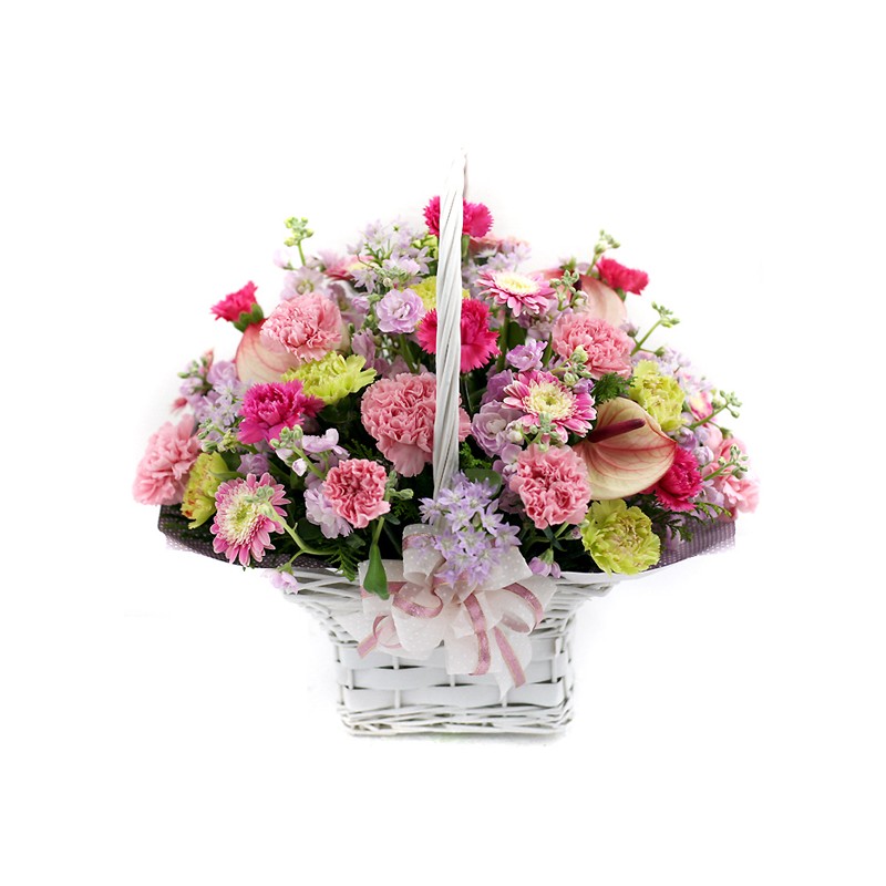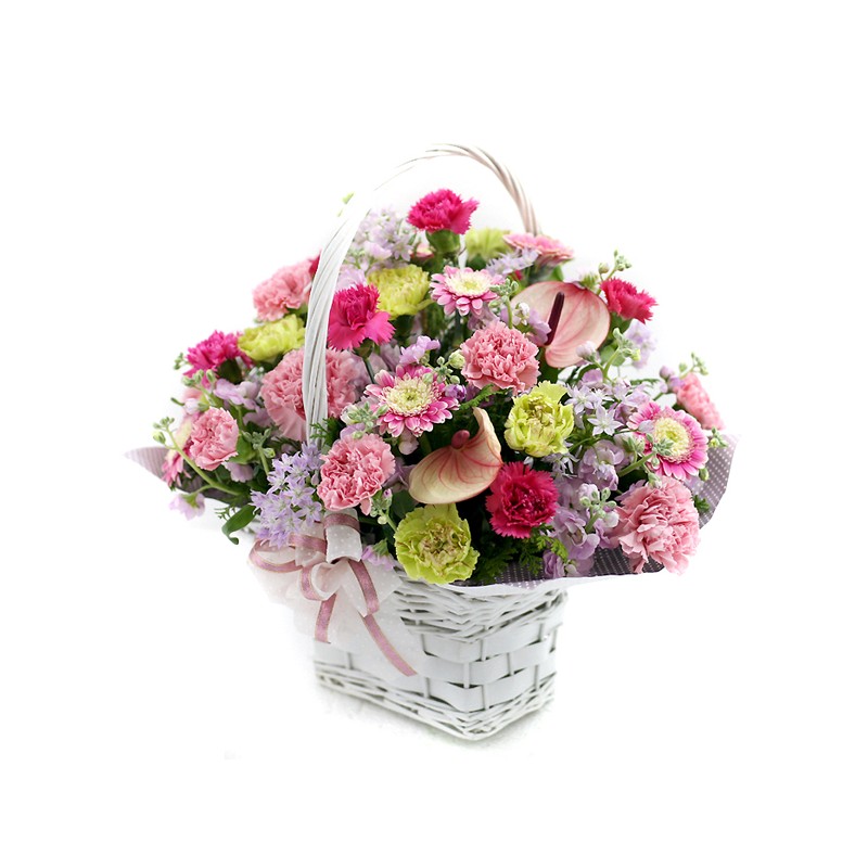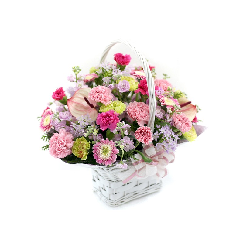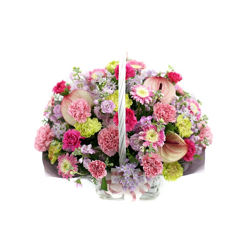 Express your thankful heart with this Pink carnations, Pink roses arranged with fresh seasonal Pastel tone blooms in a basket.