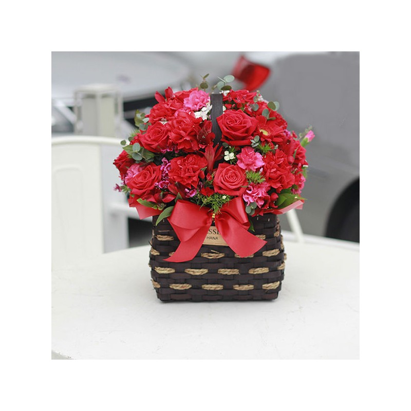 Express your thankful heart with this Red carnations, Red roses arranged with fresh seasonal blooms in a Two tone basket.