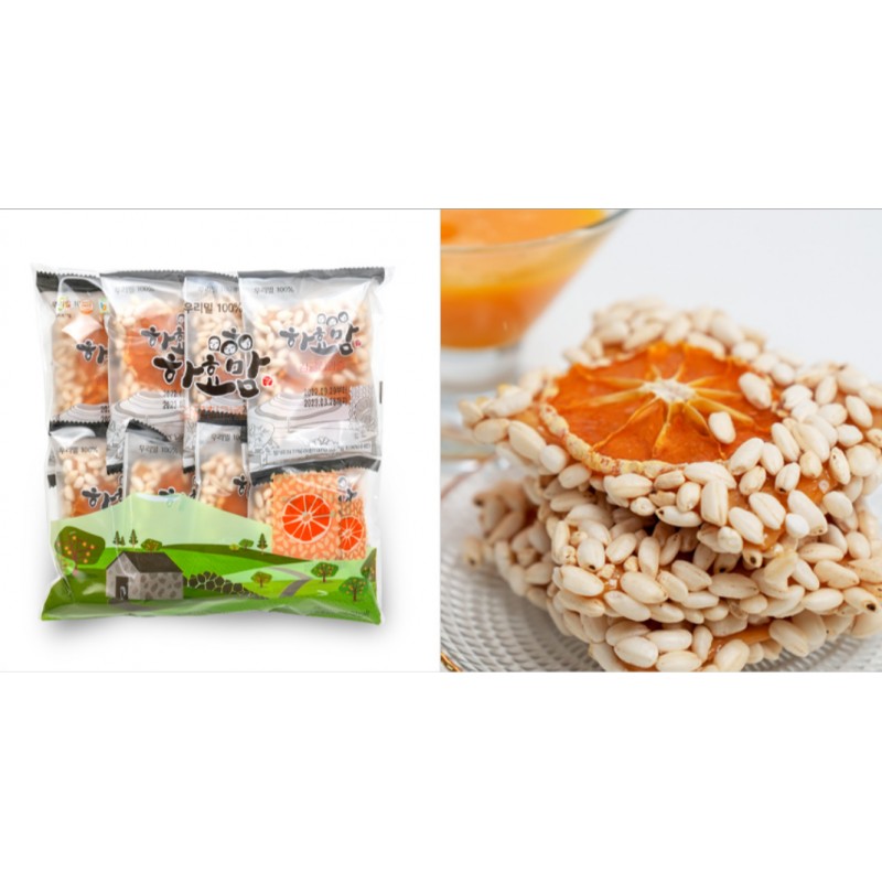 Made with 100% Korean wheat and Jeju tangerines, this Korean-made puffed rice cake is paired with Jeju tangerine chips for a refreshing, tangy flavor.